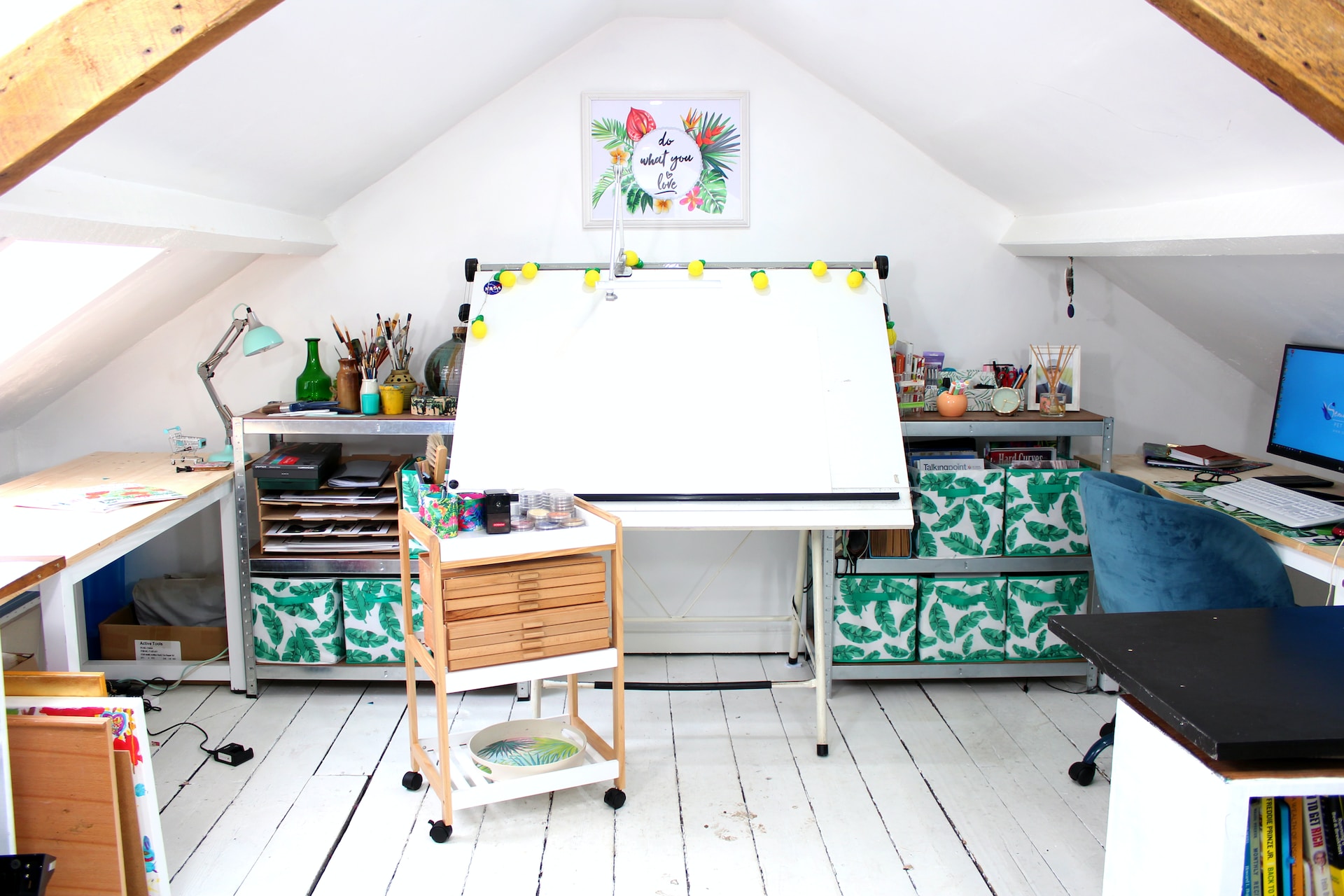Art studio illuminated by cool white light
