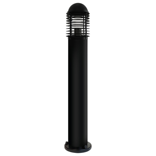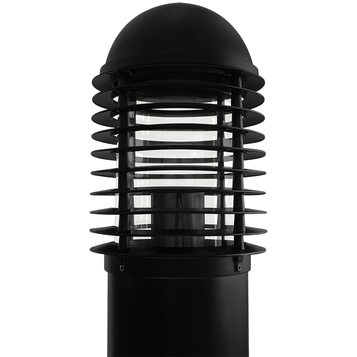 1100MM black louvred bollard, constructed out of aluminium the louvres create a discrete lighting effect, suitable for surface or root mounting. The unit is complete with a E27 lamp holder to allow end user to decide on lamp type and output up to a maximum of 100W
