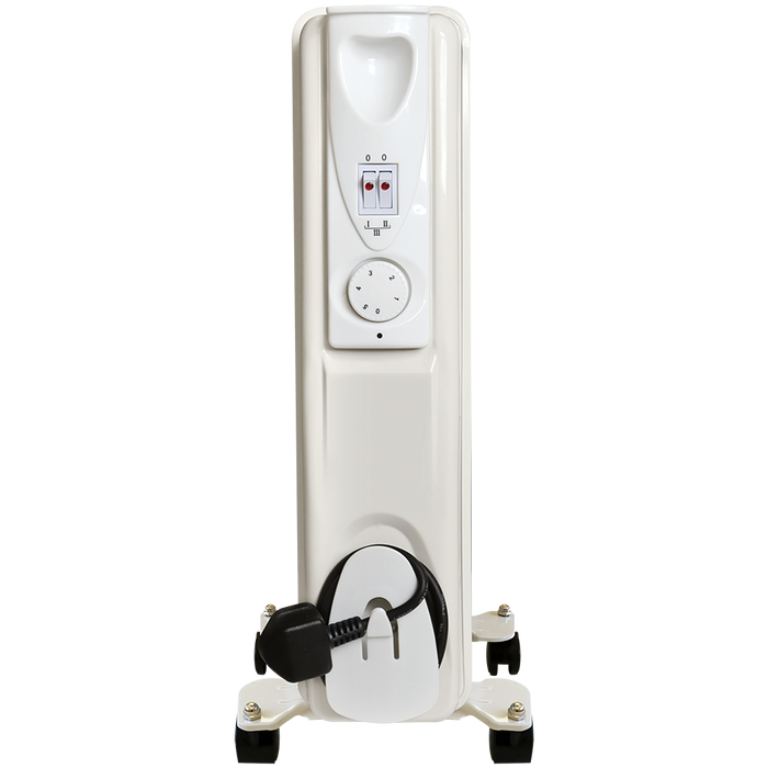Free-standing 2kW, compact and quiet oil-filled heater optimised for heat storage, with 4 wheels for easy manoeuvrability. Comes with three heat settings and adjustable thermostat for control. Provides peace of mind with overheat protection and a tip-over safety switch. Keeps things tidy with an integral store for the 1.5m cord and plug. Ideal for domestic and office environments