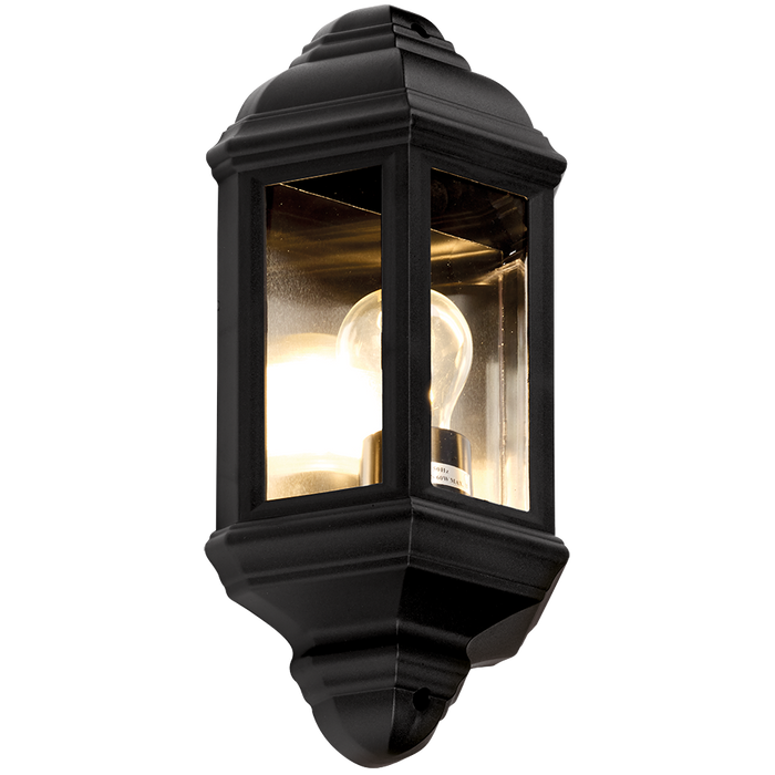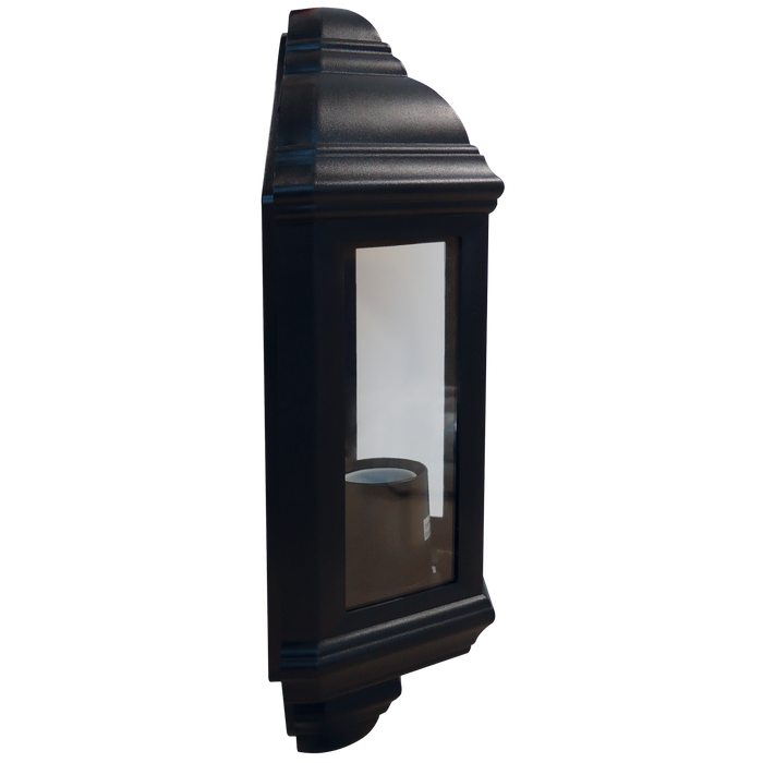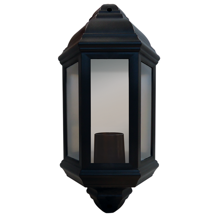 The half lantern in black is designed in tough polycarbonate to replace a traditional lantern or to update an outside space with a timeless style, the lantern comes with an E27 base for ease of maintenance