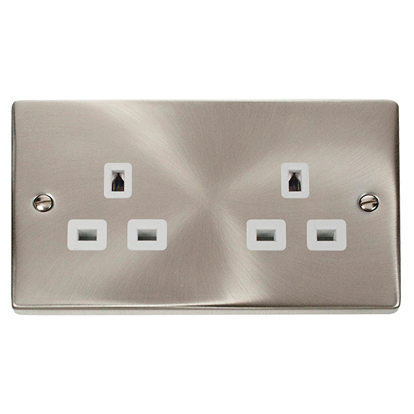 Click Deco 13A 2 Gang 3 Pin Safety Shutter Unswitched Socket Outlet Satin Chrome White Insert