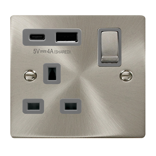 Click Deco Deco Ingot 13A 1 Gang Switched Safety Shutter Socket Outlet With Type A & C Usb (4A) Outlets Satin Chrome Grey Inserts