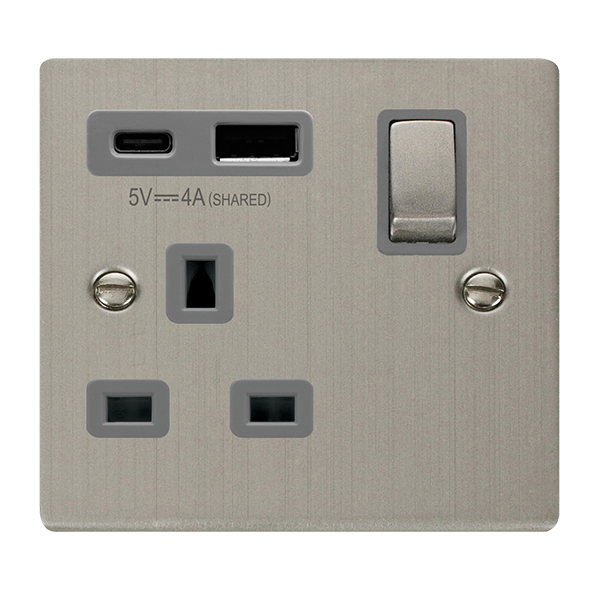 Click Deco Deco Ingot 13A 1 Gang Switched Safety Shutter Socket Outlet With Type A & C Usb (4A) Outlets Stainless Steel Grey Inserts