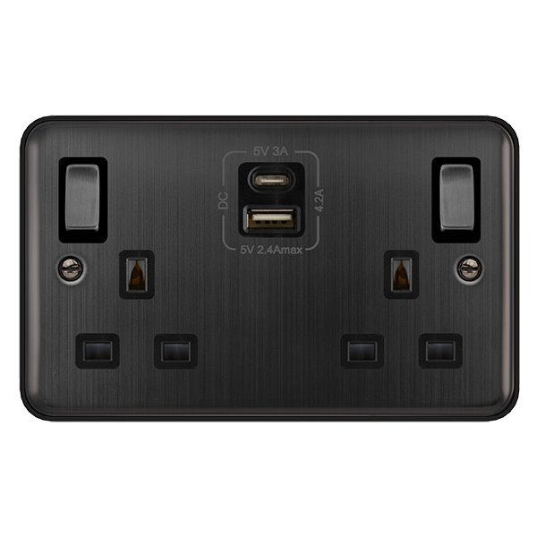 Click Deco Plus 13A Ingot 2 Gang Switched Socket Outlet With Type A & C Usb (4.2A) Outlets Matt Bronze Black Insert