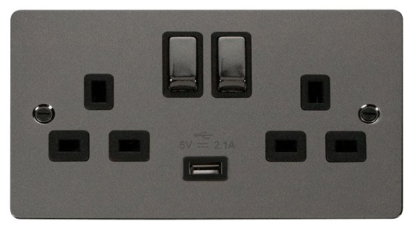 Click Define Black Nickel 13A 2G Ingot Switched Socket With 2.1A Usb Outlet Black
