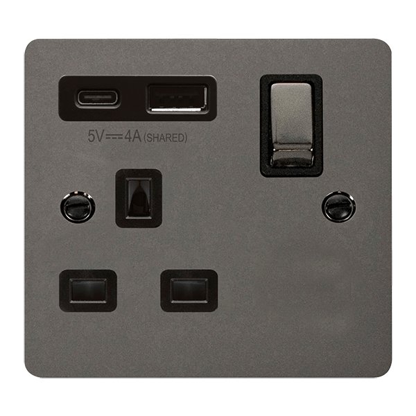Click Define Define Ingot 13A 1 Gang Switched Safety Shutter Socket Outlet With Type A & C Usb (4A) Outlets Black Nickel Black Inserts