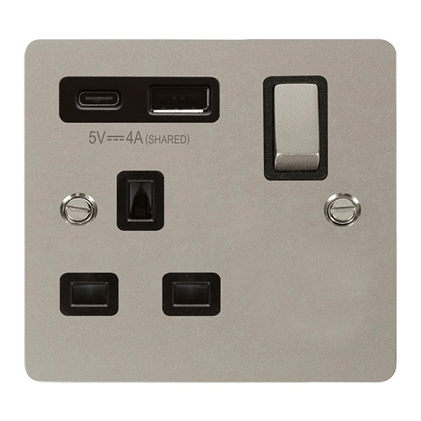 Click Define Define Ingot 13A 1 Gang Switched Safety Shutter Socket Outlet With Type A & C Usb (4A) Outlets Pearl Nickel Black Inserts