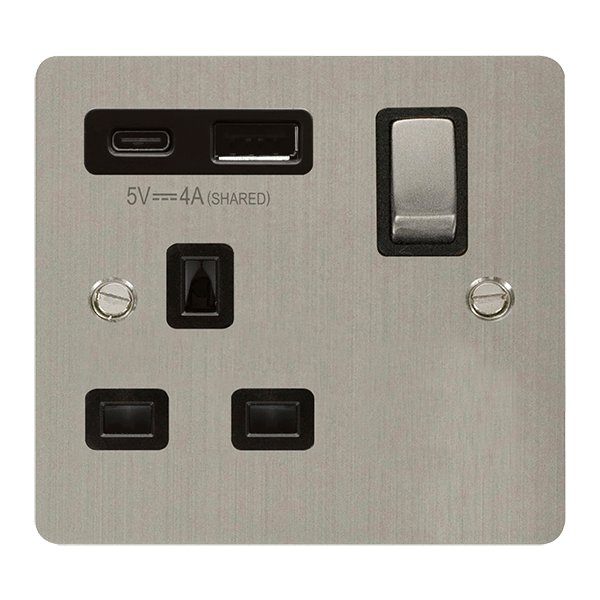 Click Define Define Ingot 13A 1 Gang Switched Safety Shutter Socket Outlet With Type A & C Usb (4A) Outlets Stainless Steel Black Inserts