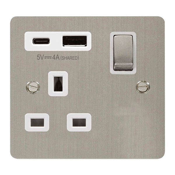 Click Define Define Ingot 13A 1 Gang Switched Safety Shutter Socket Outlet With Type A & C Usb (4A) Outlets Stainless Steel White Inserts