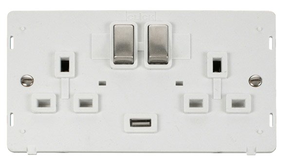 Click Definity 13A 2G Ingot Switched Socket With 2.1A Usb Outlet Insert White / Stainless Steel