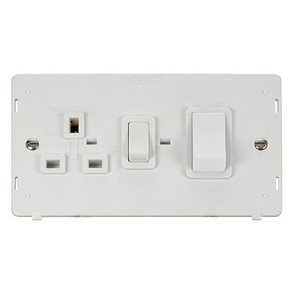 Click Definity 50A 2 Gang Double Pole Switch With 13A Double Pole Switched Socket Outlet Insert Polar White Insert & Rockers