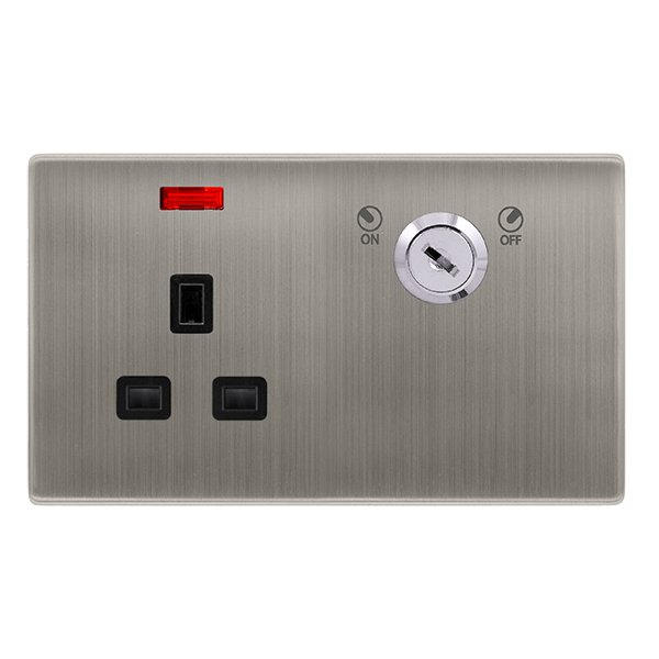 Click Definity Complete 13A 1 Gang Double Pole Key Lockable Socket With Neon Stainless Steel Cover Plate Black Insert