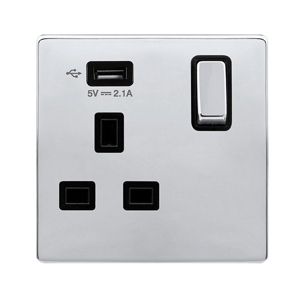 Click Definity Complete 13A Ingot 1 Gang Switched Socket With 2.1A Usb Outlet Polished Chrome Cover Plate Black Insert