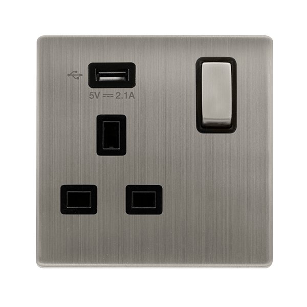 Click Definity Complete 13A Ingot 1 Gang Switched Socket With 2.1A Usb Outlet Stainless Steel Cover Plate Black Insert