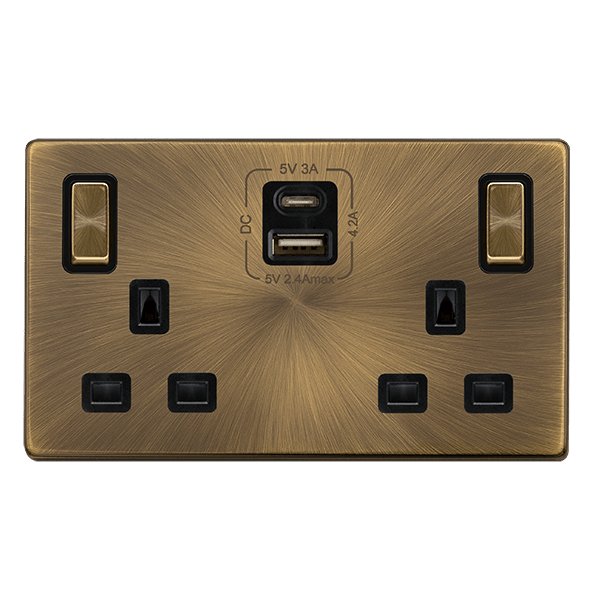 Click Definity Complete 13A Ingot 2 Gang Switched Safety Shutter Socket With Type A & C Usb Antique Brass Cover Plate Black Insert