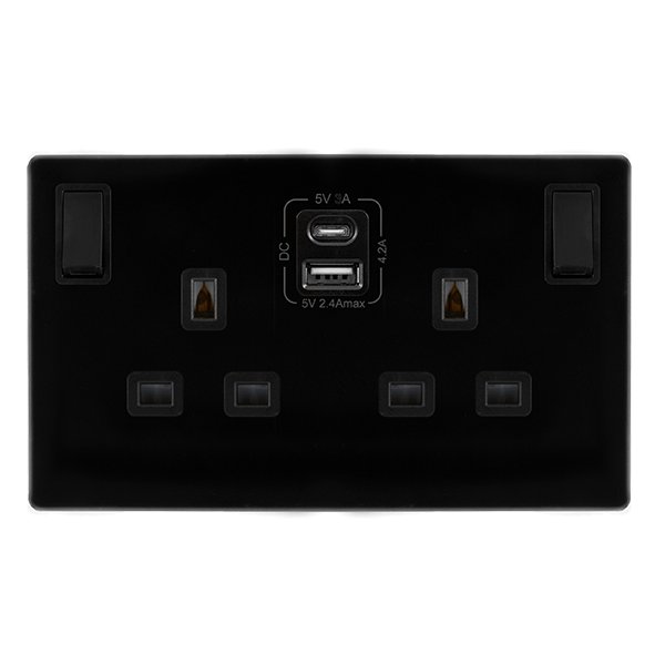 Click Definity Complete 13A Ingot 2 Gang Switched Safety Shutter Socket With Type A & C Usb Metal Black Cover Plate Black Insert