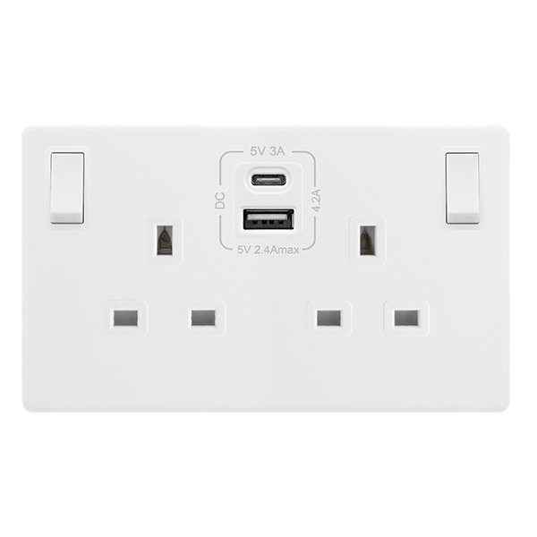Click Definity Complete 13A Ingot 2 Gang Switched Safety Shutter Socket With Type A & C Usb Polar White Cover Plate Polar White Insert