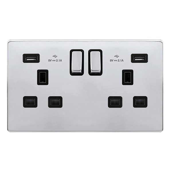 Click Definity Complete 13A Ingot 2 Gang Switched Socket With 2.1A Usb Outlets Polished Chrome Cover Plate Black Insert