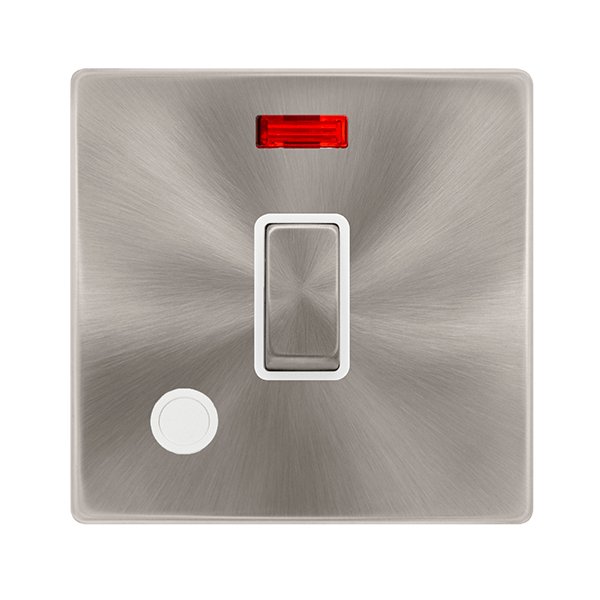 Click Definity Complete 20A Ingot Double Pole Switch With Neon & Flex Outlet Brushed Steel Cover Plate Polar White Insert