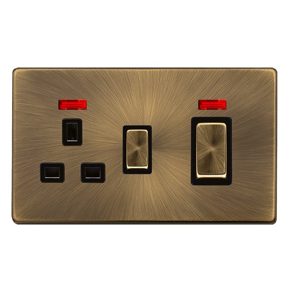 Click Definity Complete 50A Ingot Double Pole Switch With 13A Double Pole Switched Socket & Neon Antique Brass Cover Plate Black Insert