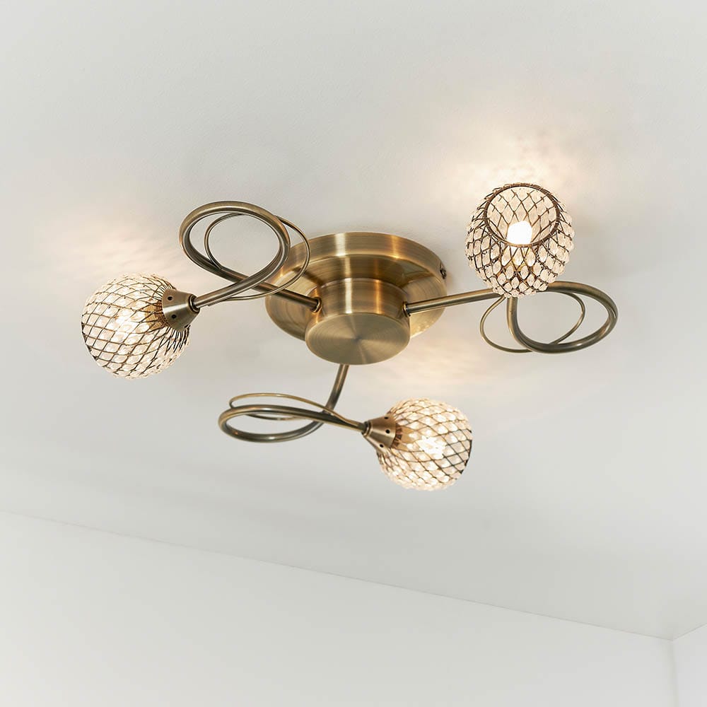 The Aherne 3 light flush finished in antique brass will add style to any room, featuring mesh shades encrusted with clear glass beads. Suitable for use with LED G9 lamps.