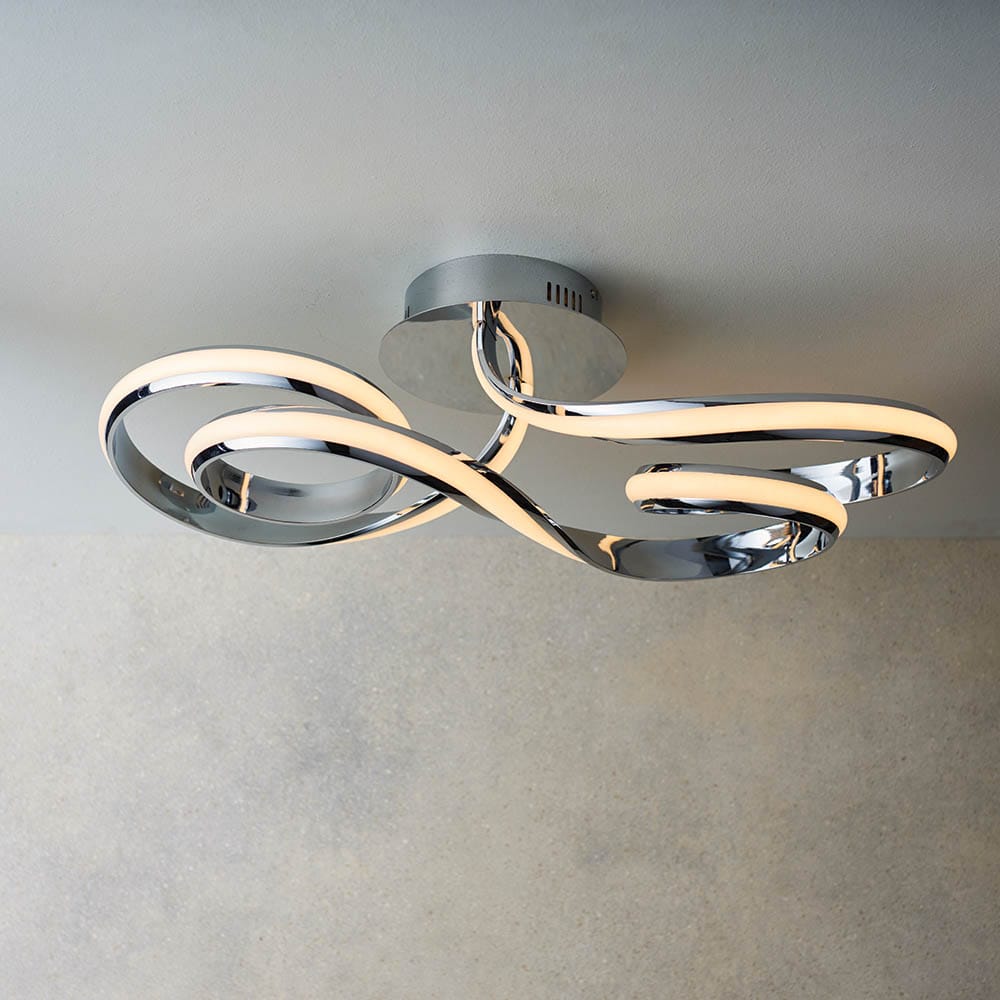 A unique contemporary ceiling light with flowing illuminated curves, creating an amazing designer look for modern interiors. Chrome plated finish with white diffuser and Integrated LED.