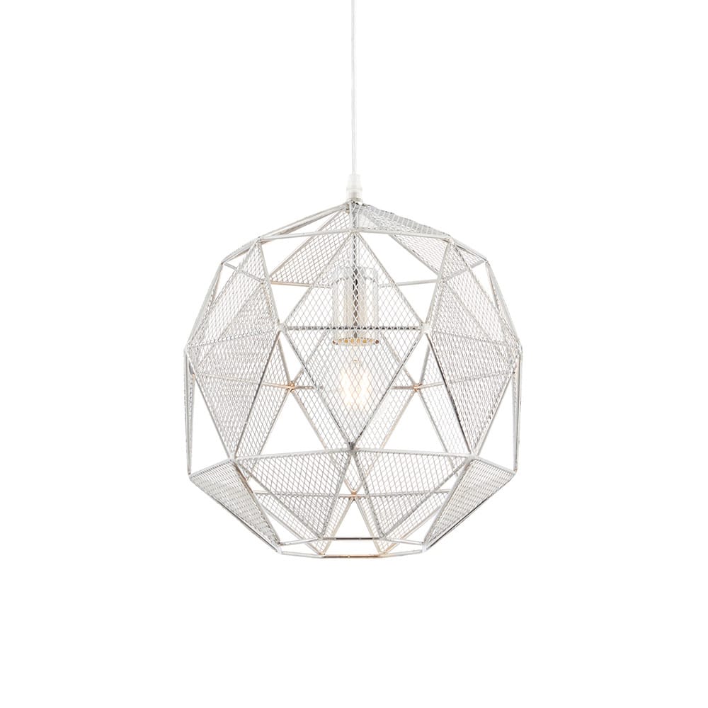The Armour pendant is on trend with its geometric, angular design and chrome effect finish. Formed from a collection of mesh triangles, the cut outs create a fabulous light effect. Dimmable and compatible with LED lamps. Also available in a copper plate.