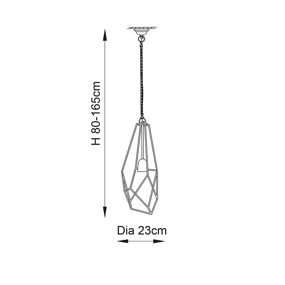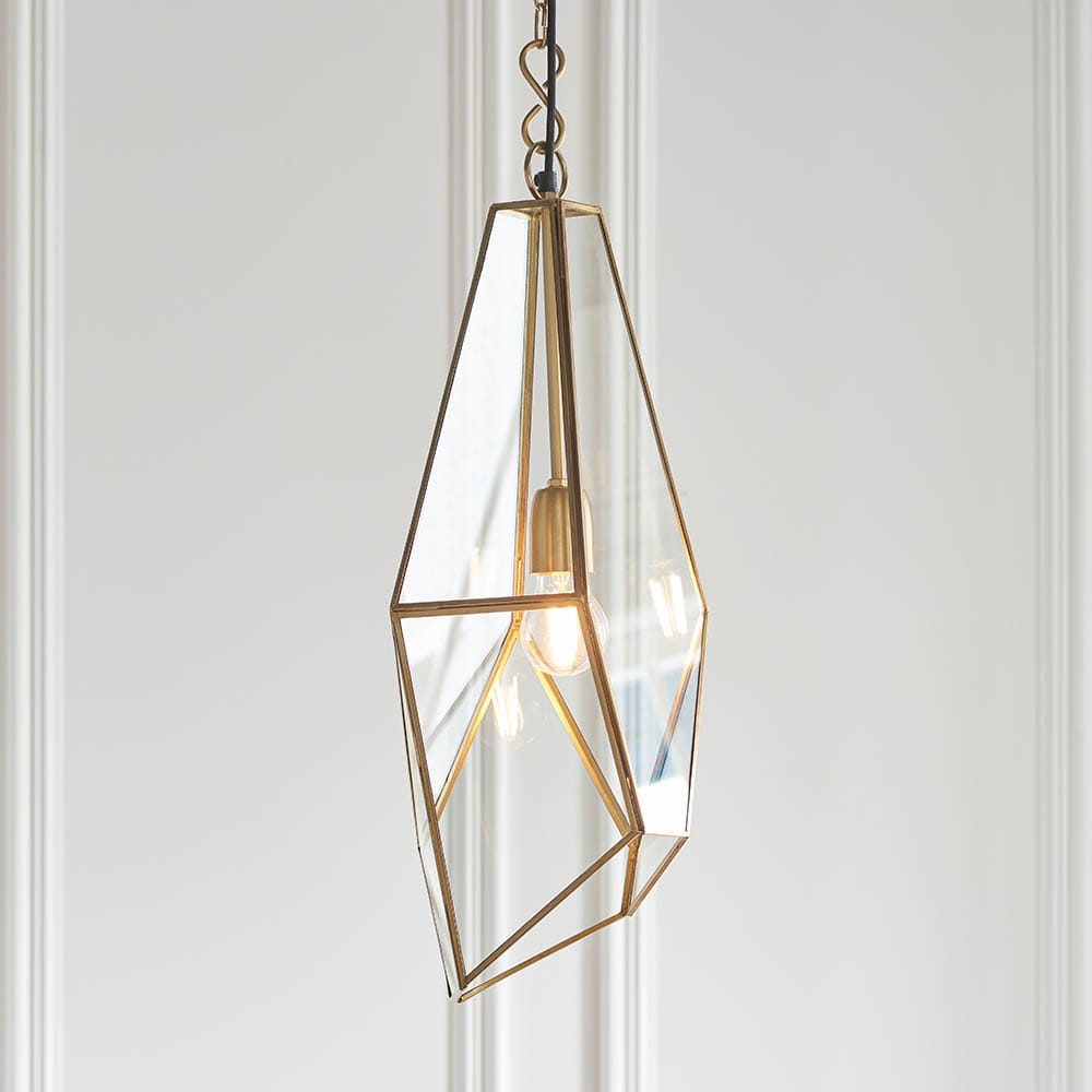 An angular cage pendant made from glass panels with an antique brass effect trim. Compatible with LED lamps and dimmable.