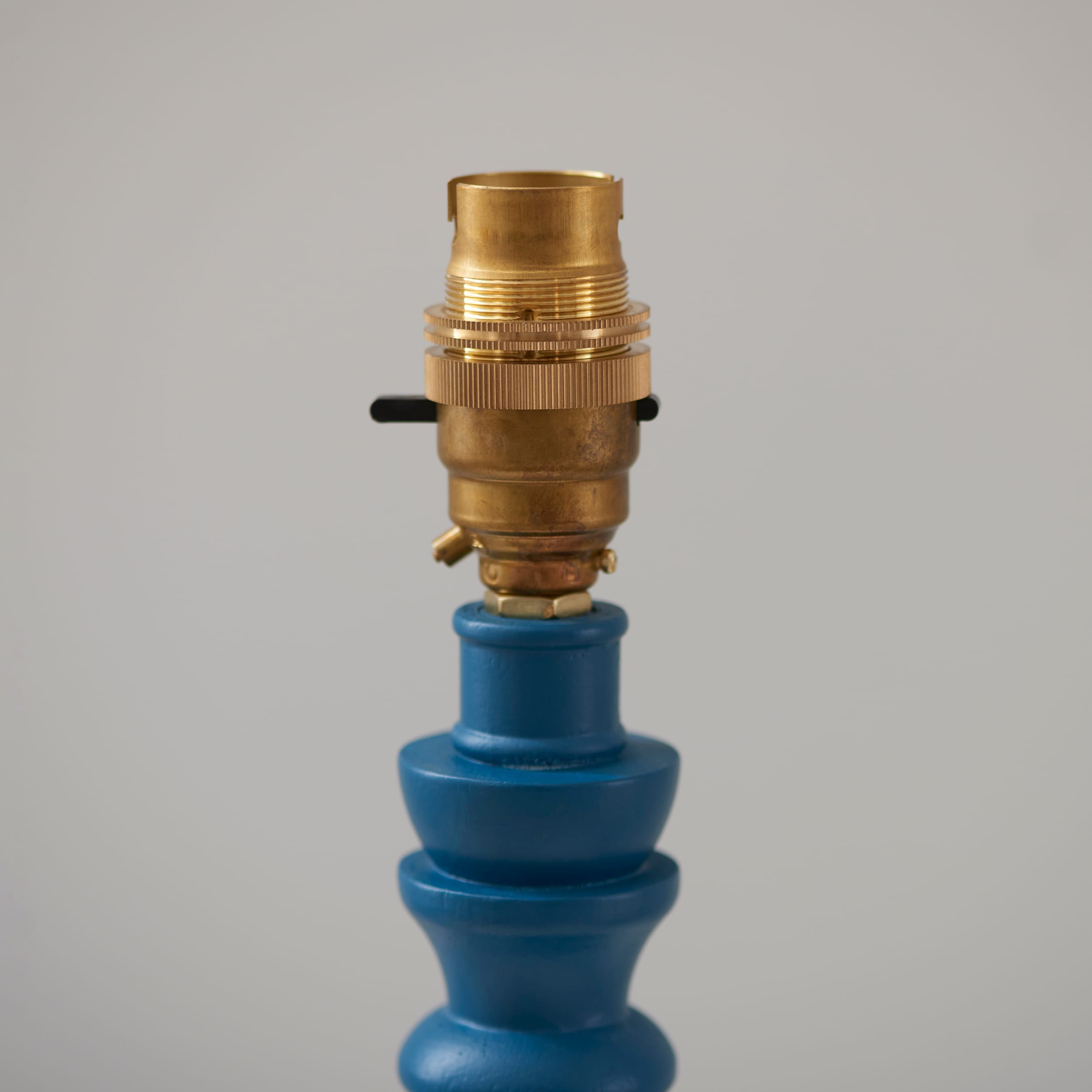 Beautiful wooden turned spindle light, painted satin marlin blue. Perfect for classic interiors, featuring a brass B22 switched lamp holder and grey braided fabric flex. Pair with one of our 16cm or 20cm decorative fabric shades for a unique classic look.