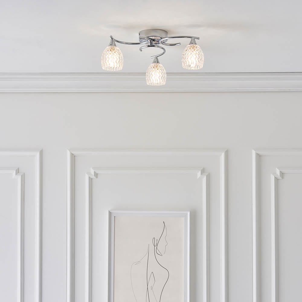 A 3 light flush ceiling fitting with curved metal arms in a chrome finish, and cut glass shades. suitable for use with LED lamps and dimmable. Matching items and other colour options available