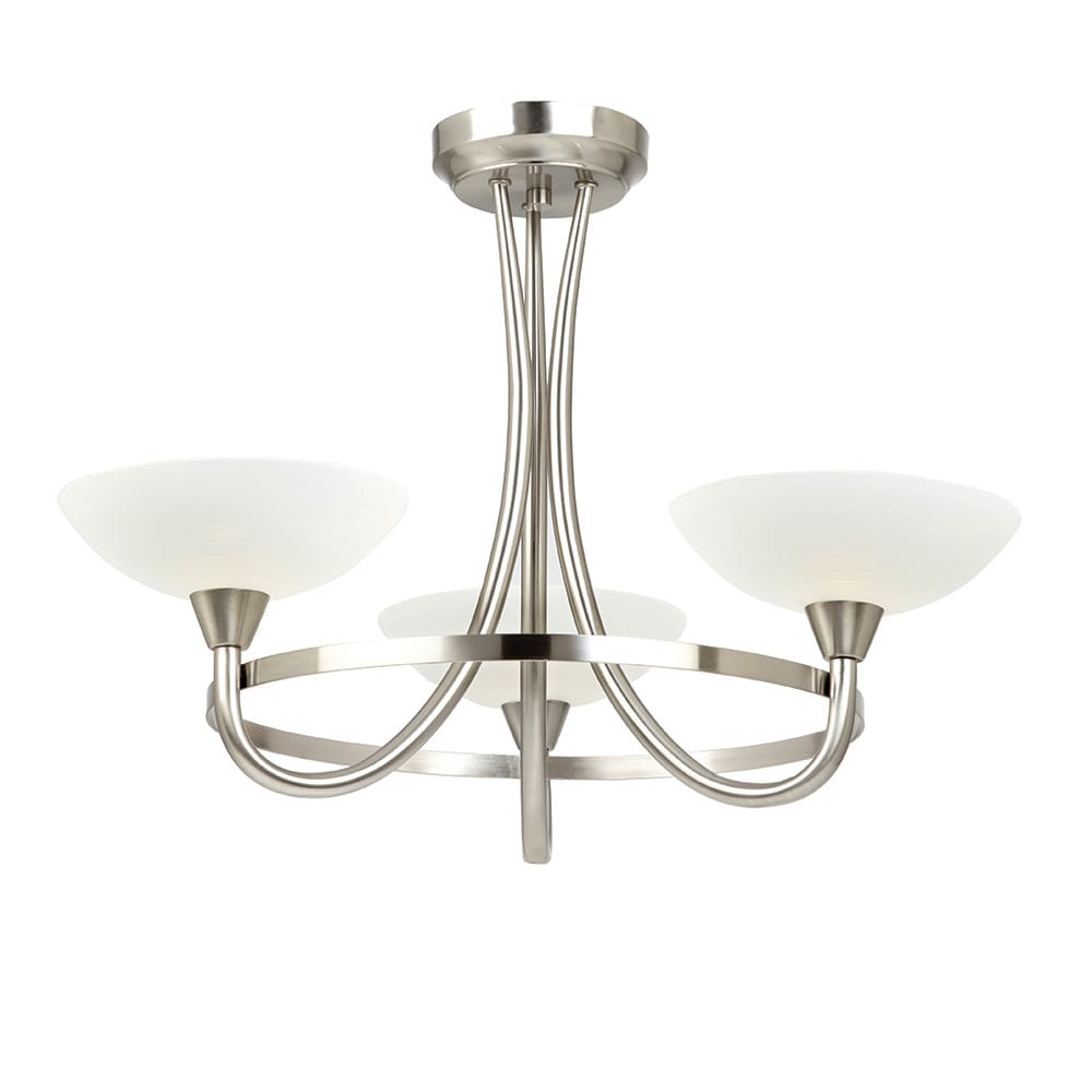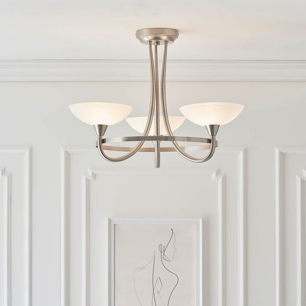 The Cagney 3 light semi flush is finished in satin chrome effect with white painted glass shades with faint line detailing. suitable for use with LED lamps and dimmable; matching 5 light semi flush and wall light options and antique brass finish also available