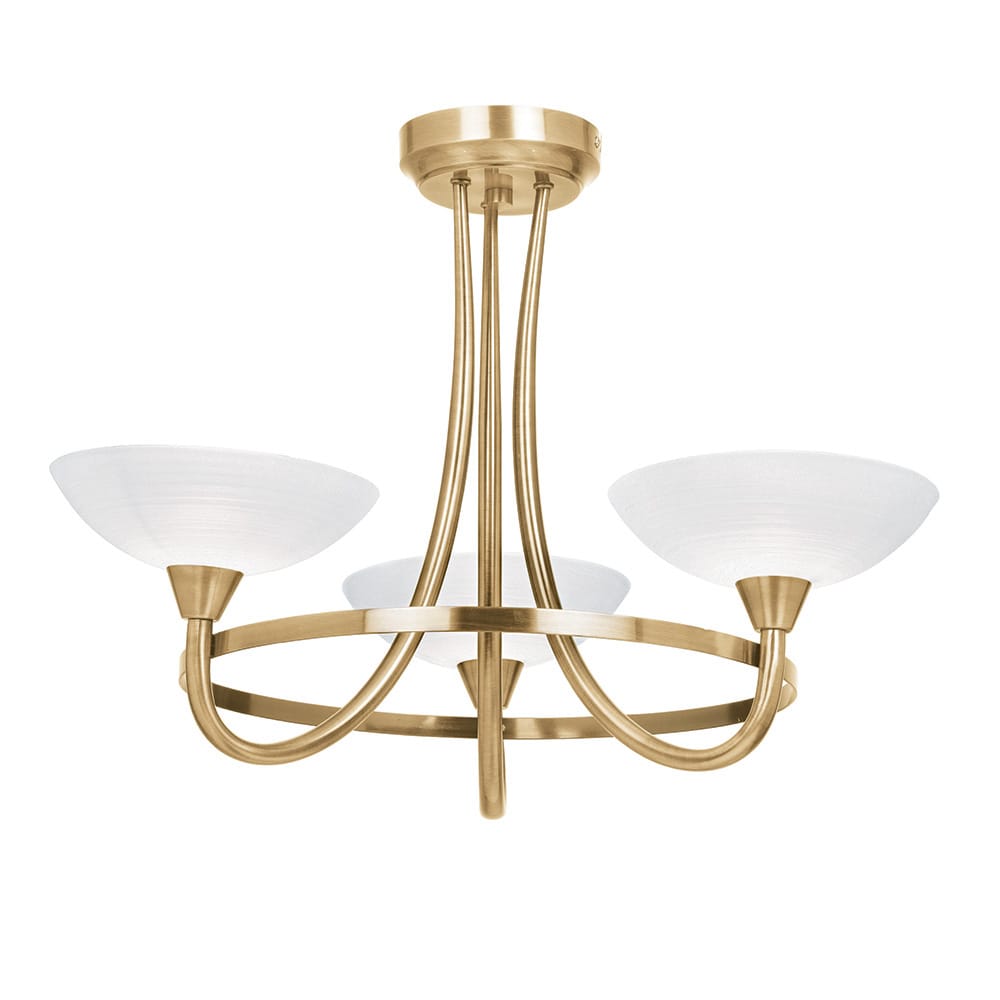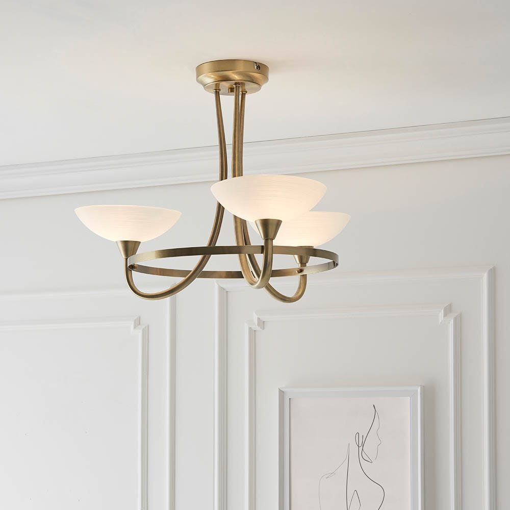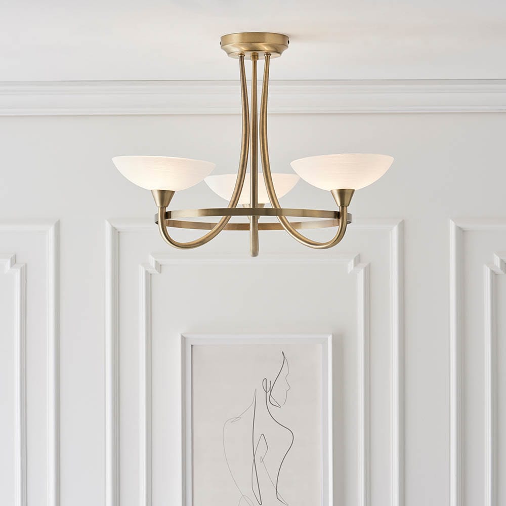 The Cagney 3 light semi flush is finished in antique brass effect with white painted glass shades with faint line detailing. suitable for use with LED lamps and dimmable; matching 5 light semi flush and wall light options and satin chrome finish also available