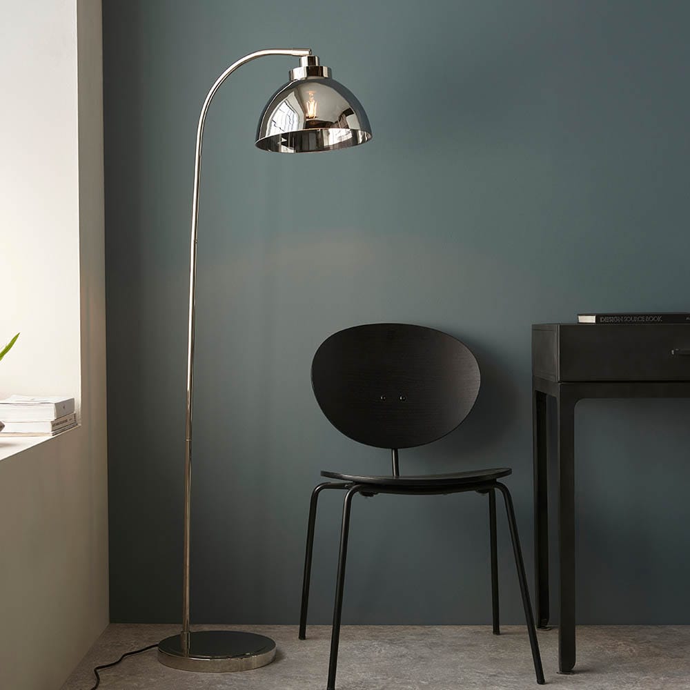 A modern silhouette with a contemporary bright nickel plated finish and smokey mirror effect tinted glass. Creating a stylish interplay with light this is the perfect floor light for bringing the smart metallic design style into your interiors. Other items available in this range.