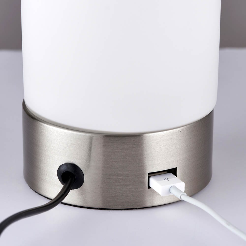 A sleek dual purpose table light finished in a brushed nickel effect plate, with a matt opal glass shade. This light is operated by clever 3 stage touch technology, plus has the addition of a discreet USB port meaning it can charge your devices too.