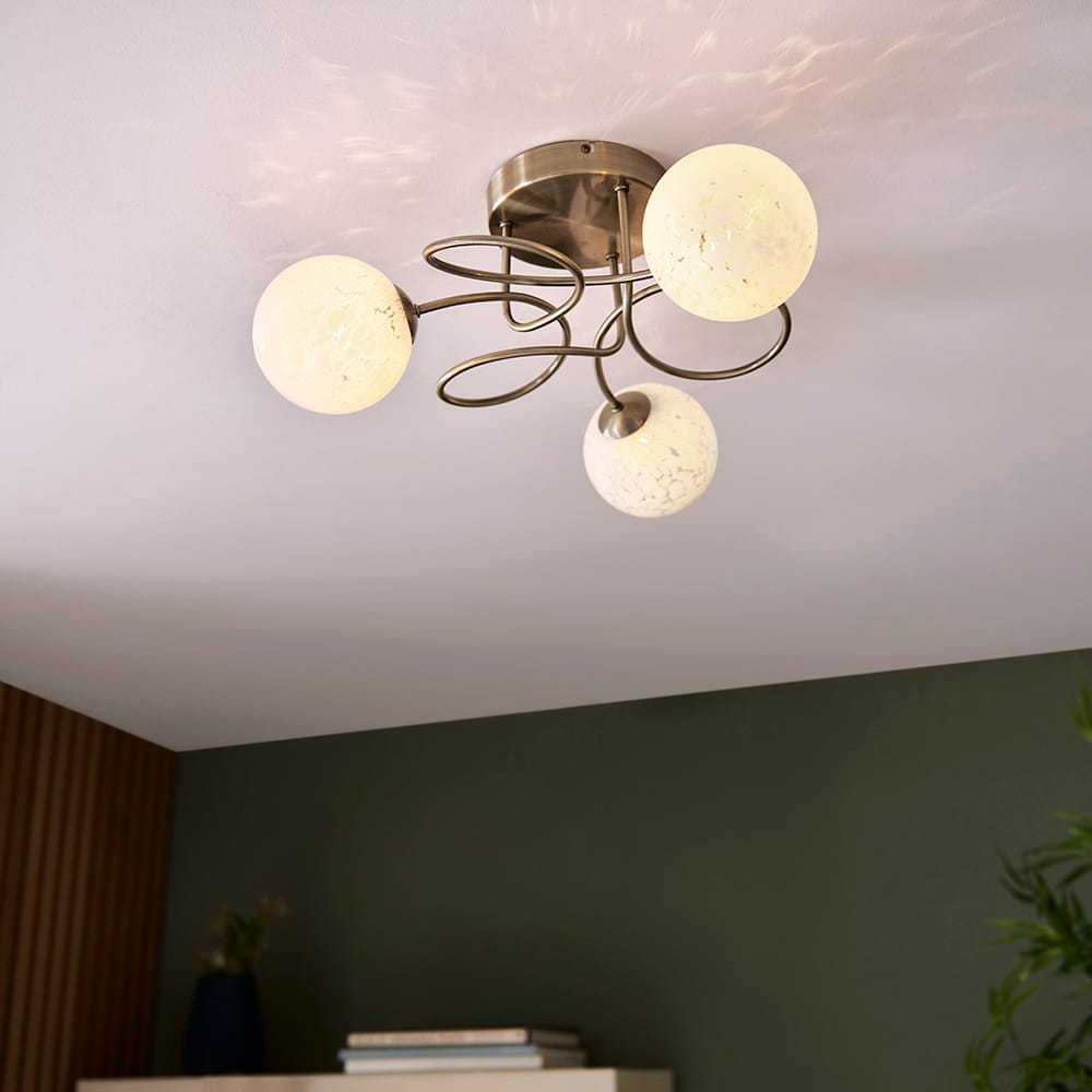 Modern design with a nod to the classic. Confetti glass is set amongst designer intertwined arms for antique brass plate finish flush light; perfect for low ceilings.