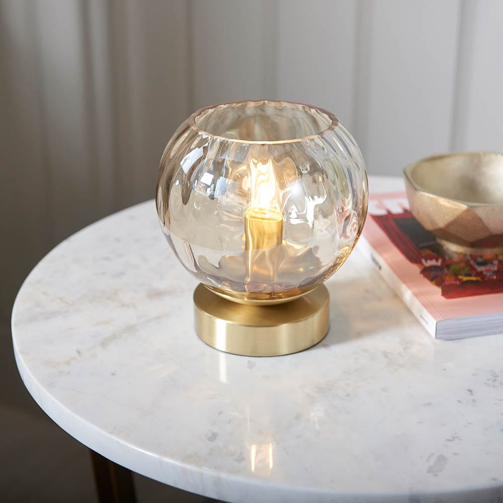 Champagne lustre glass meets modern satin brushed gold plating in a combination of modern classic styling. This easily placeable table light is the perfect addition to your modern home. Add a touch of style to your interior with a matching ceiling light, wall light and floor lamp. Ideal when paired with up to date LED filament lamps.