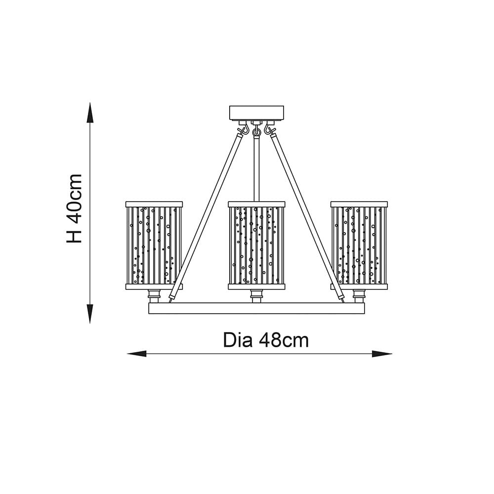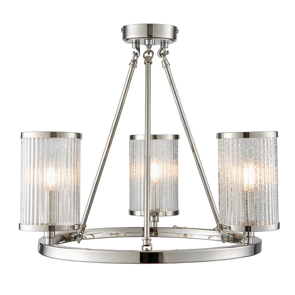 A unique classic styled chandelier in bright nickel plated finish. Inspired by hurricane lamps, the clear ribbed glass shades with bubble details create a perfect diffused light when lit by filament LED lamps . Each shade rests subtly on the rectangular section hoop and is suspended by three fixed arms.