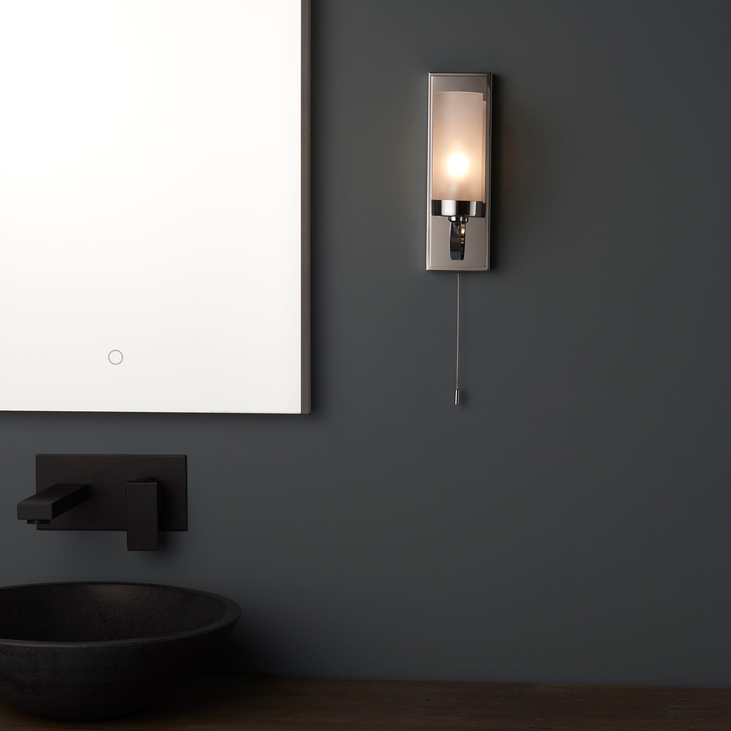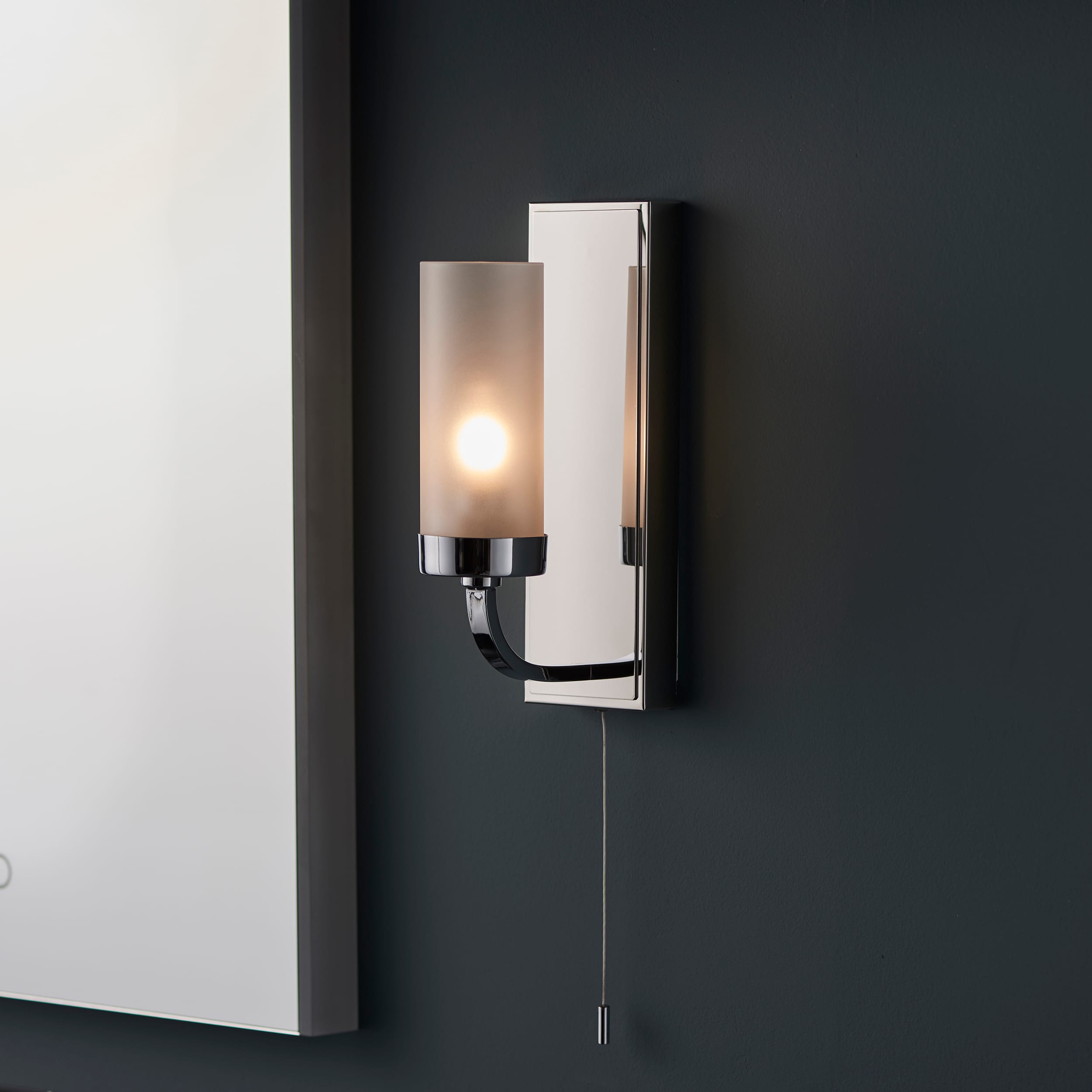 A modern IP rated bathroom wall light; with polished chrome and frosted glass for a stylish finish.