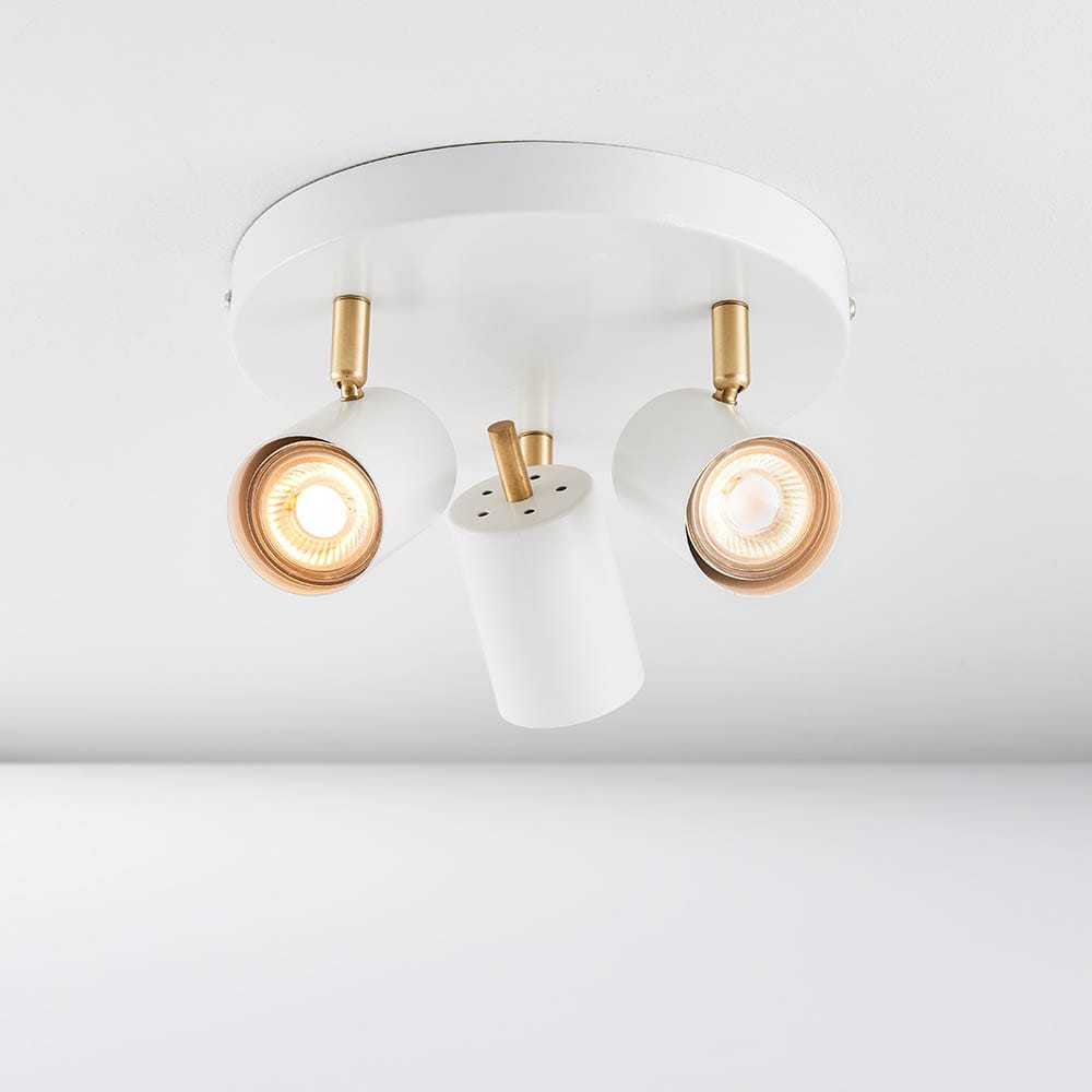 Adjustable LED spotlight finished in matt white and satin gold effect trim. An energy efficient fitting which is also available in single and bar options