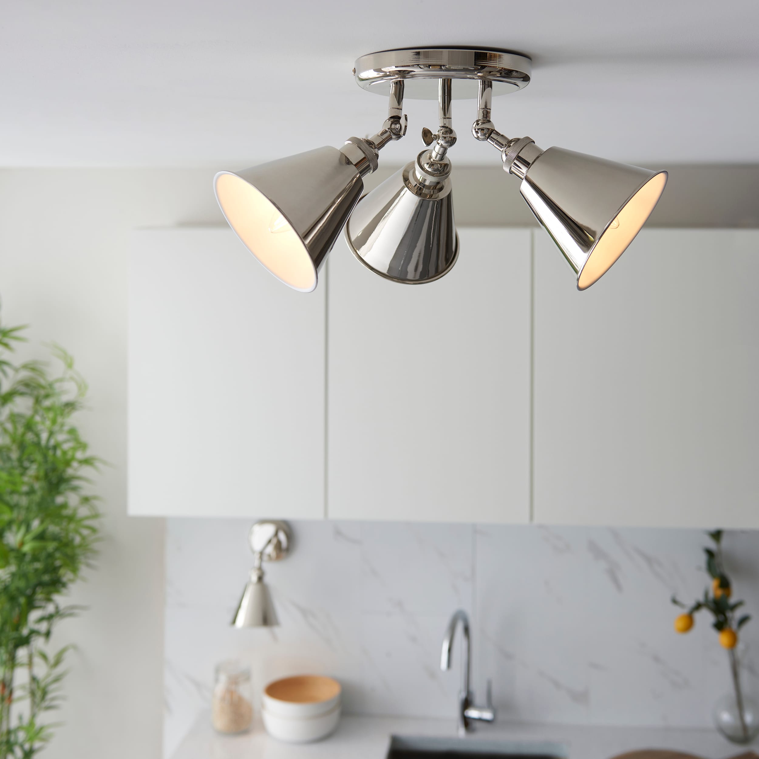 A true timeless classic collection featuring this 3-light spotlight, in bright nickel plate with adjustable shades; providing targeted lighting for everyday tasks around the home.