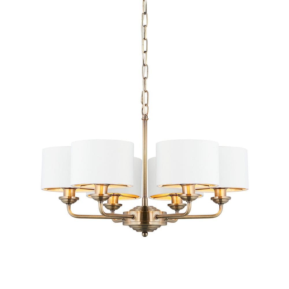The Highclere multi arm pendant is a sophisticated mix of vintage white fabric shade lined with gold metallic inner and antique brass plated metalwork. This statement light is the perfect timeless addition to modern and classic homes of today.