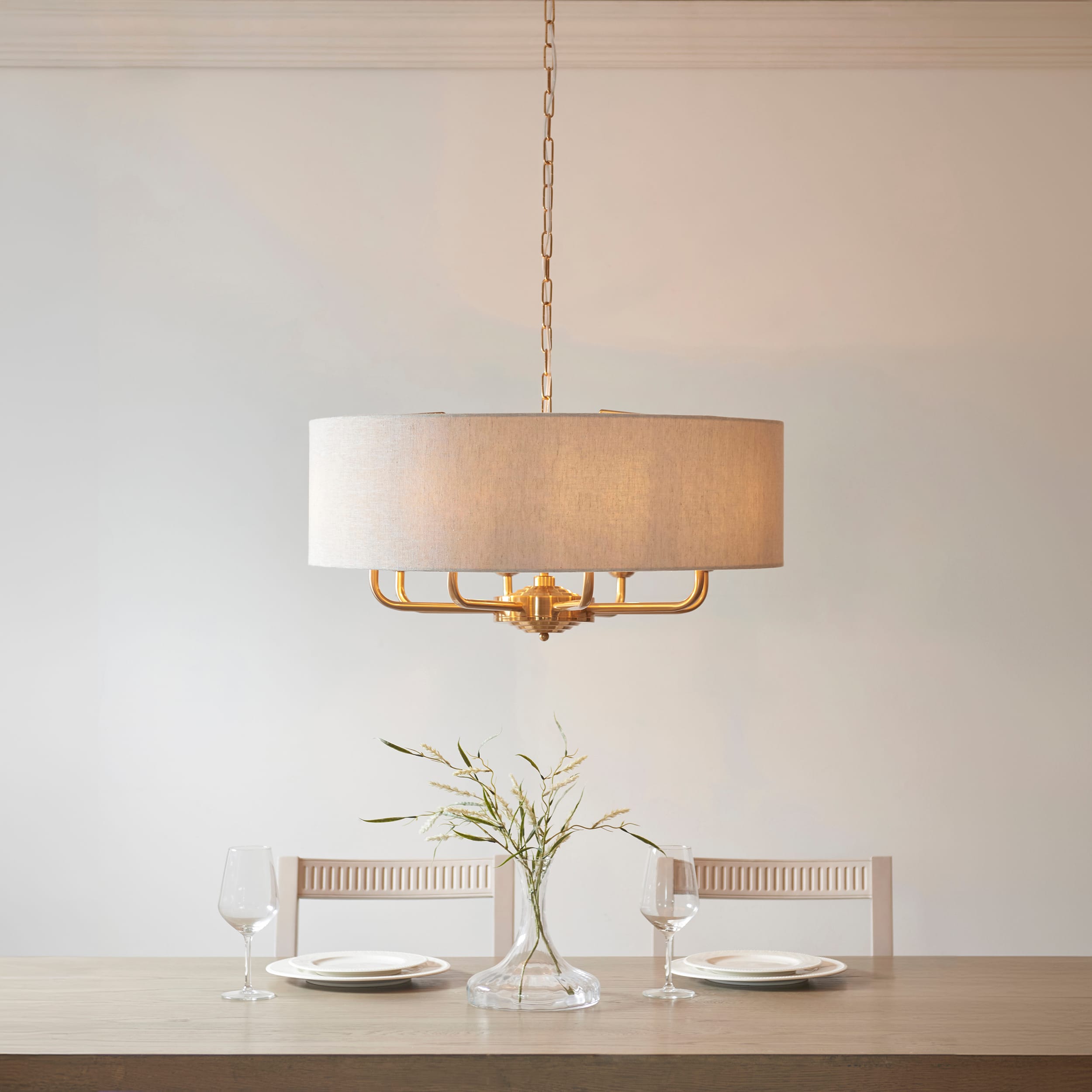 The Highclere 8 light pendant is a sophisticated mix of a single large natural linen fabric shade, with matching colour cotton inner and vintage brass plated metalwork. This statement light is the perfect timeless addition to modern and classic homes.