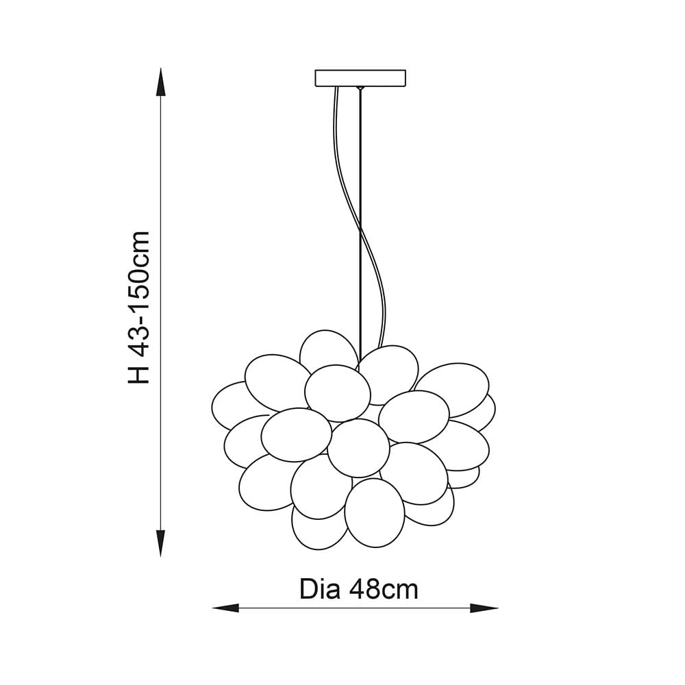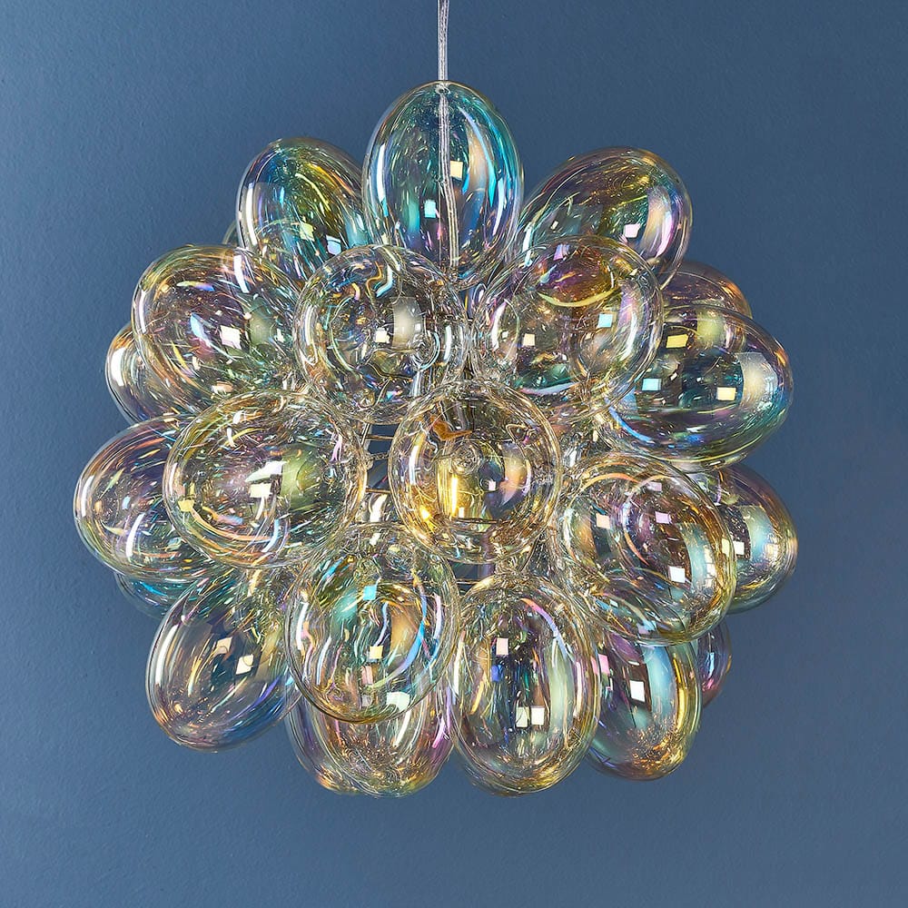 A stunning addition to modern interiors, the chrome plated Infinity ceiling pendant creates amazing light patterns through multiple iridescent glass shades. Suspended from height adjustable wire cable and clear flex.