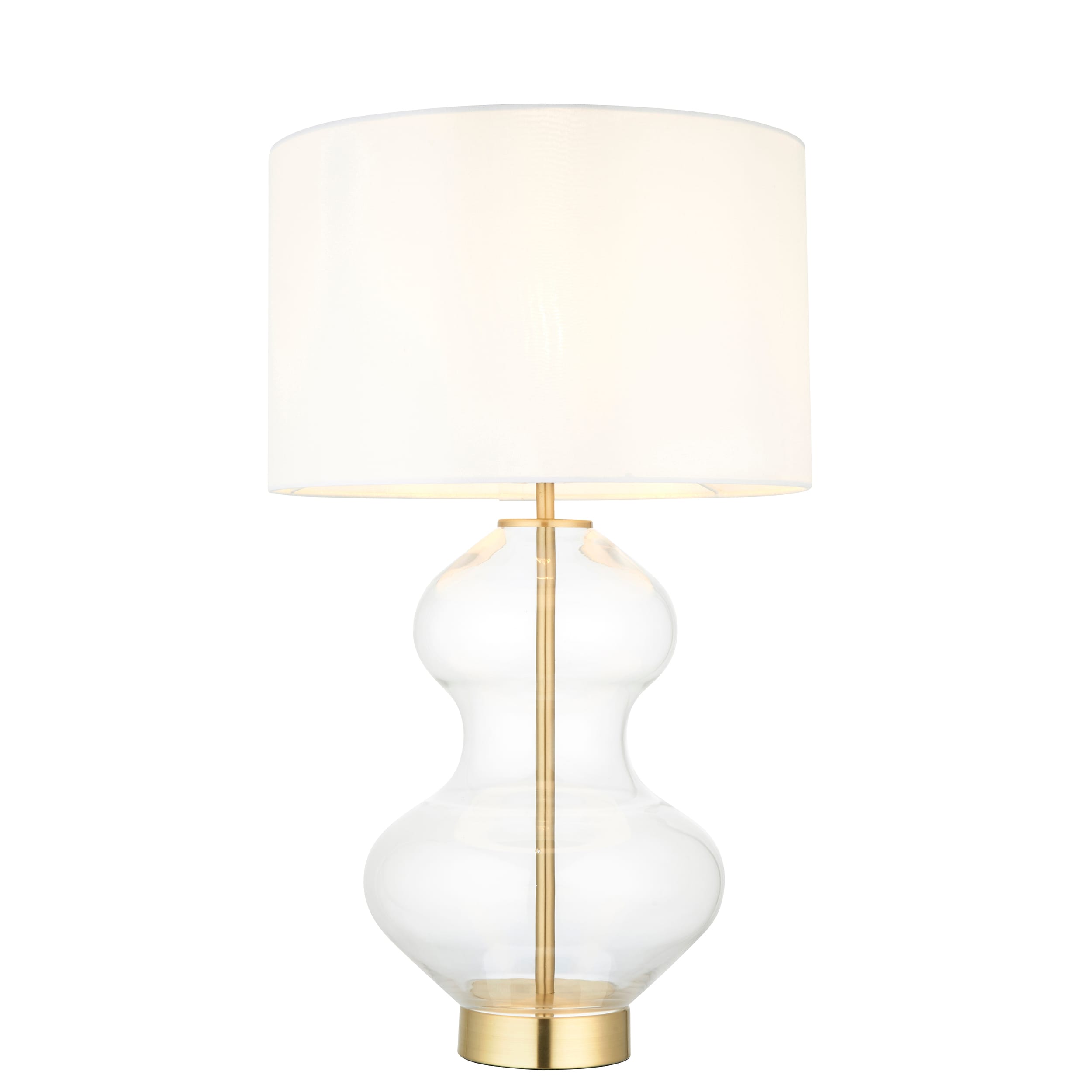 Elegant and extremely versatile, this classic table light features a clear glass basewith a vintage white fabric shade. Its distinctive hourglass silhouette is the ideal partner for either contemporary or classic interiors. Available in satin brass or polished nickel with a three-stage touch dimmer.