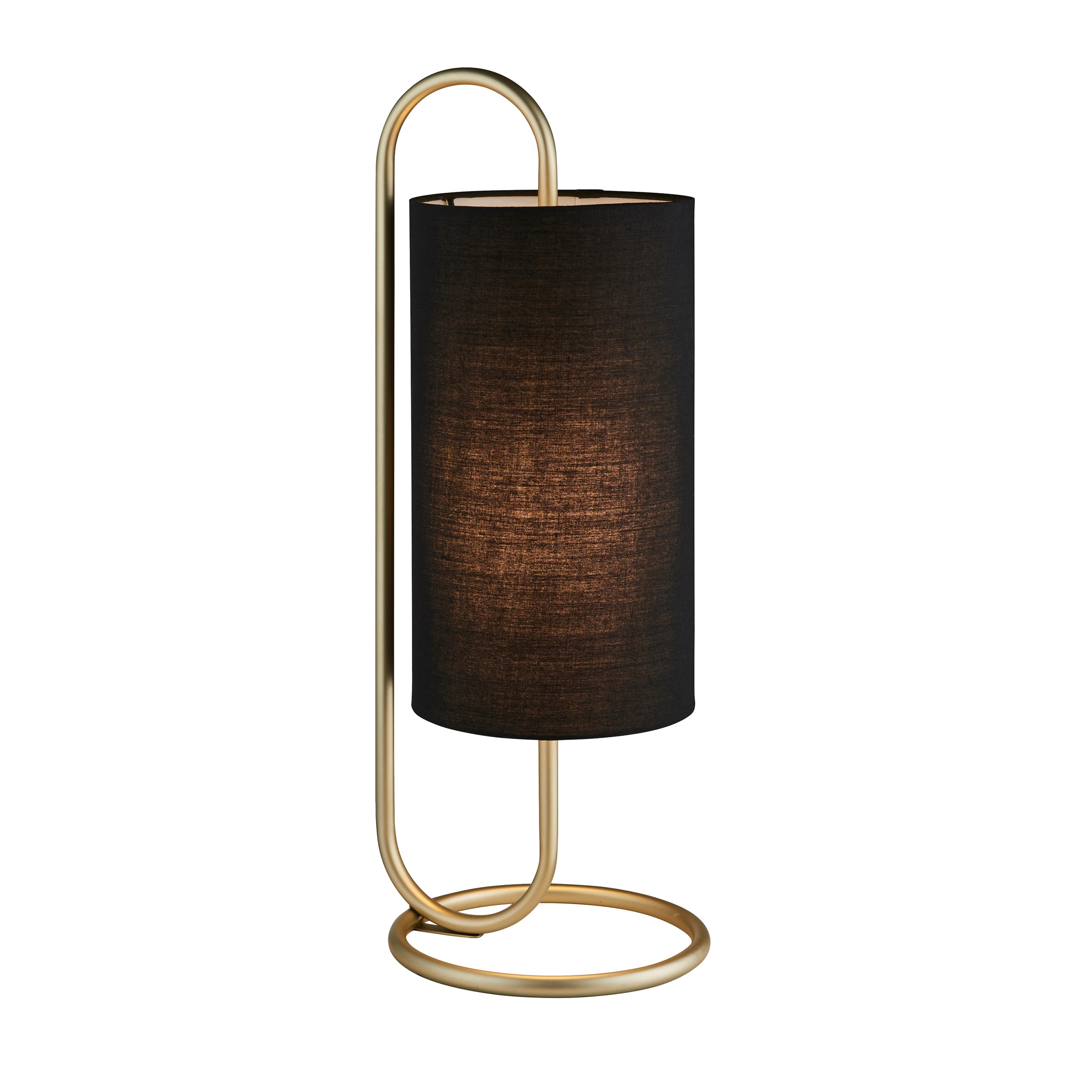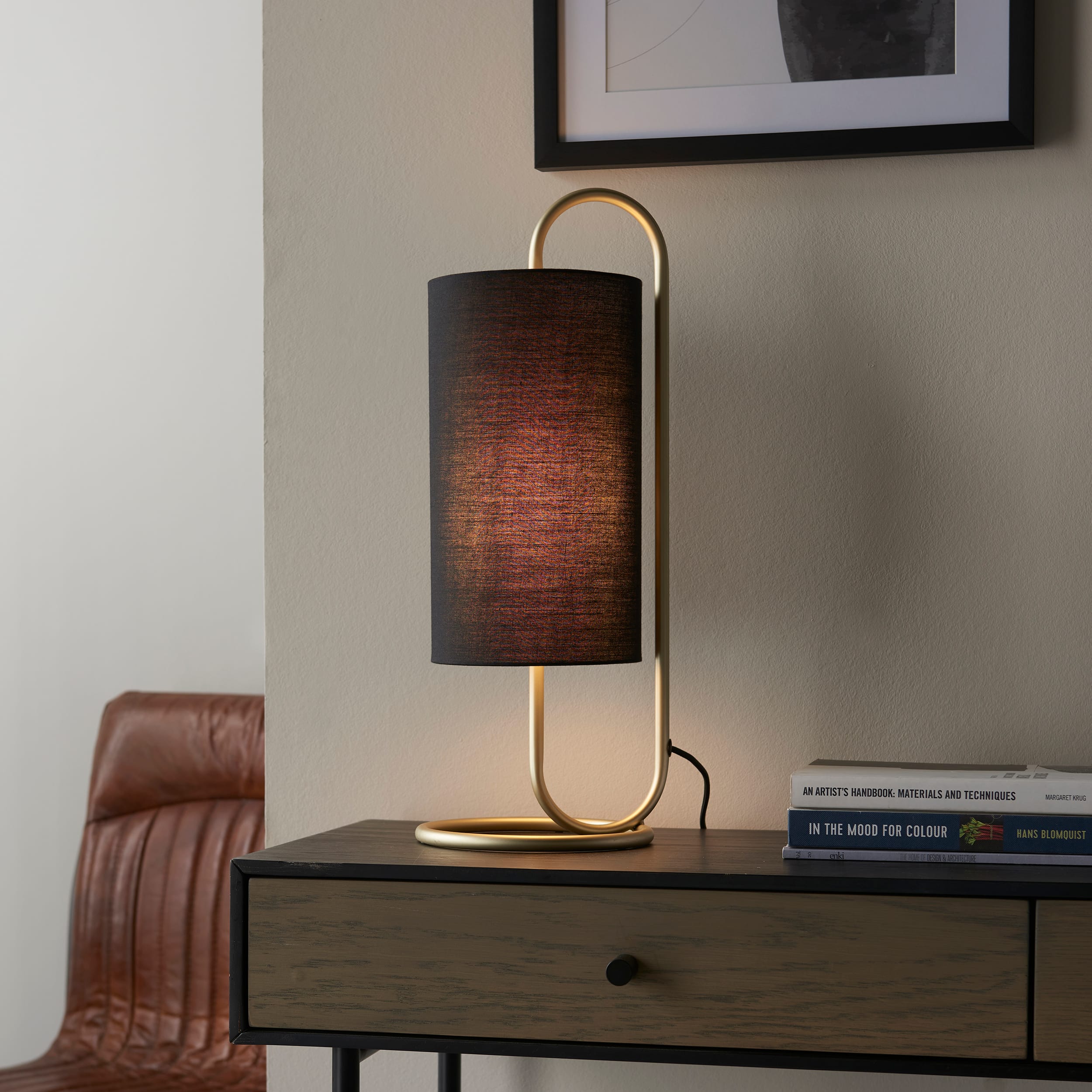 Floating cylinder black fabric shade encapsulated by the soft curves of antique brass painted metal work. Atable light perfect for today’s contemporary living; other finishes also available.