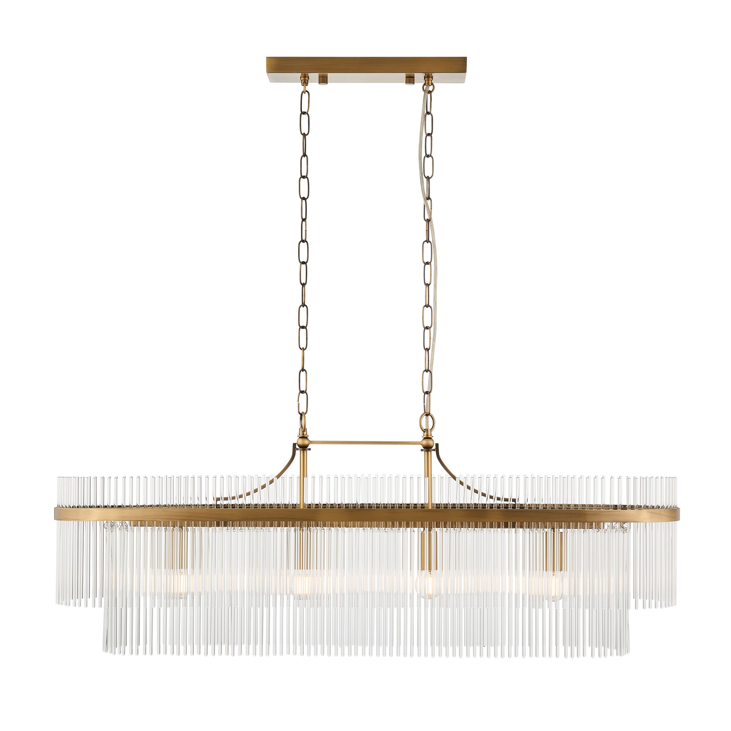 This linear 4 light pendant is perfect for adding a classic timeless look to dinning rooms. Finished in antique brass and decorated with clear glass rods that delicately diffuse the light, suspended from height adjustable chain, with clear flex.