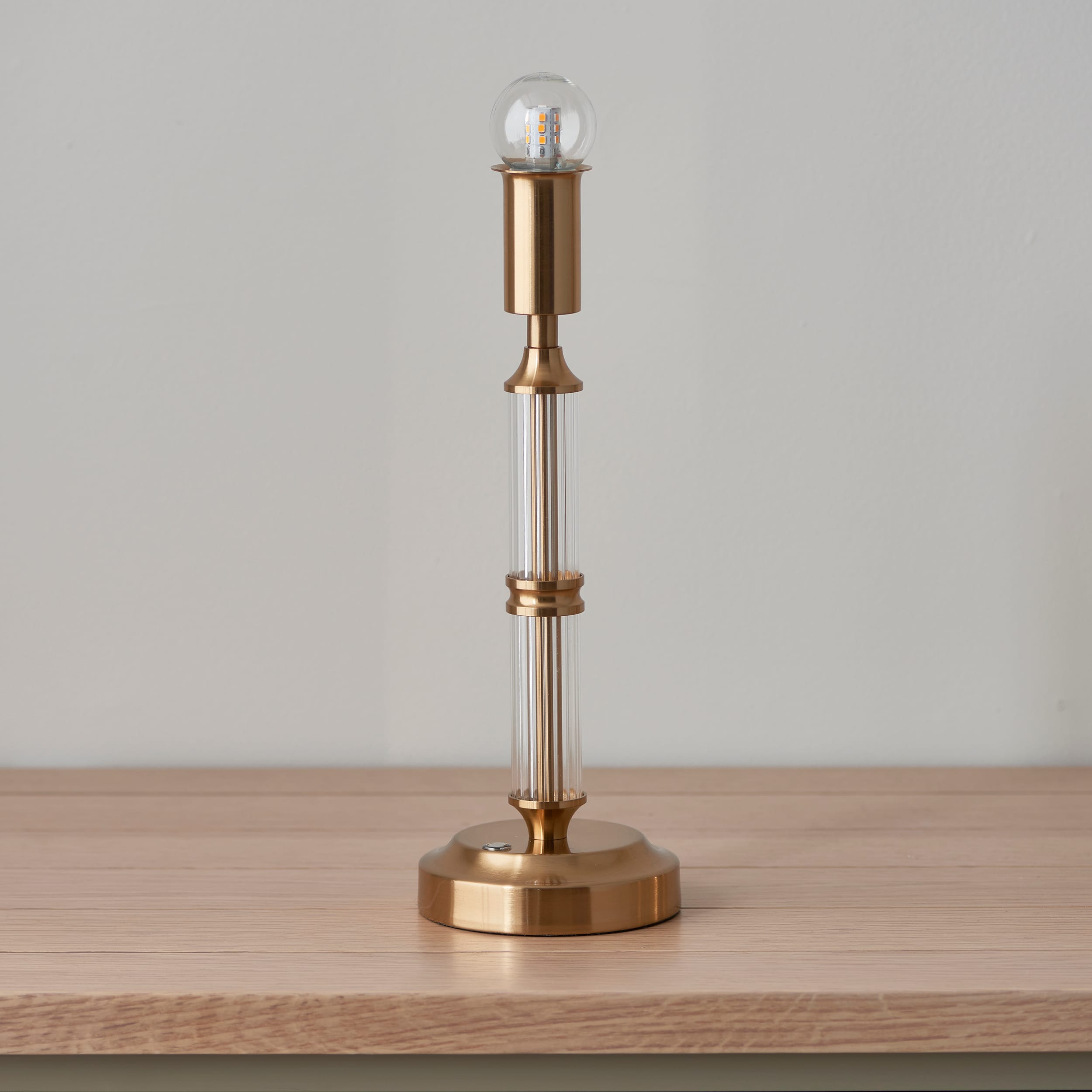 Not tied down by the need for a power cable, this portable, rechargeable 3 stage touch dimmer table lamp enables you to select your own level of light. Classic in style and finished in aged brass with clear acrylic details, making it easy to place around your home. Turns on for low light then touch controlled to increase light level to medium then bright, making it the perfect bedside light. Taking just 5.5 hours to fully charge and giving up to 36 hours of continuous light.Be creative! Place on shelving, hallways, bedsides or dining tables, a totally versatile addition to your home. Pair with one of our 16cm decorative clip-on shades for the perfect timeless style.