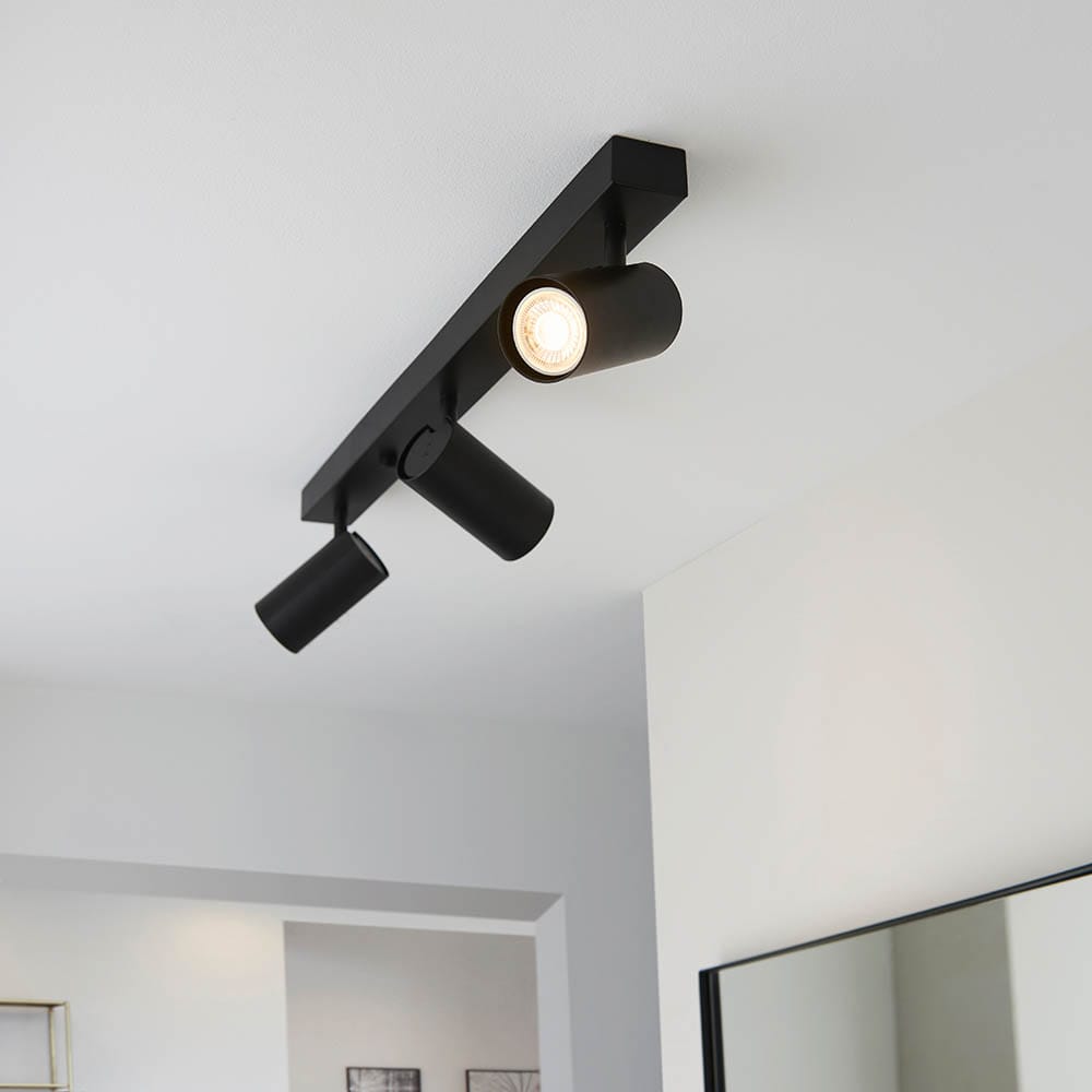 Three light spotlight housed on bold matt black paint frame, creating a strong clean silhouette and directional lighting.