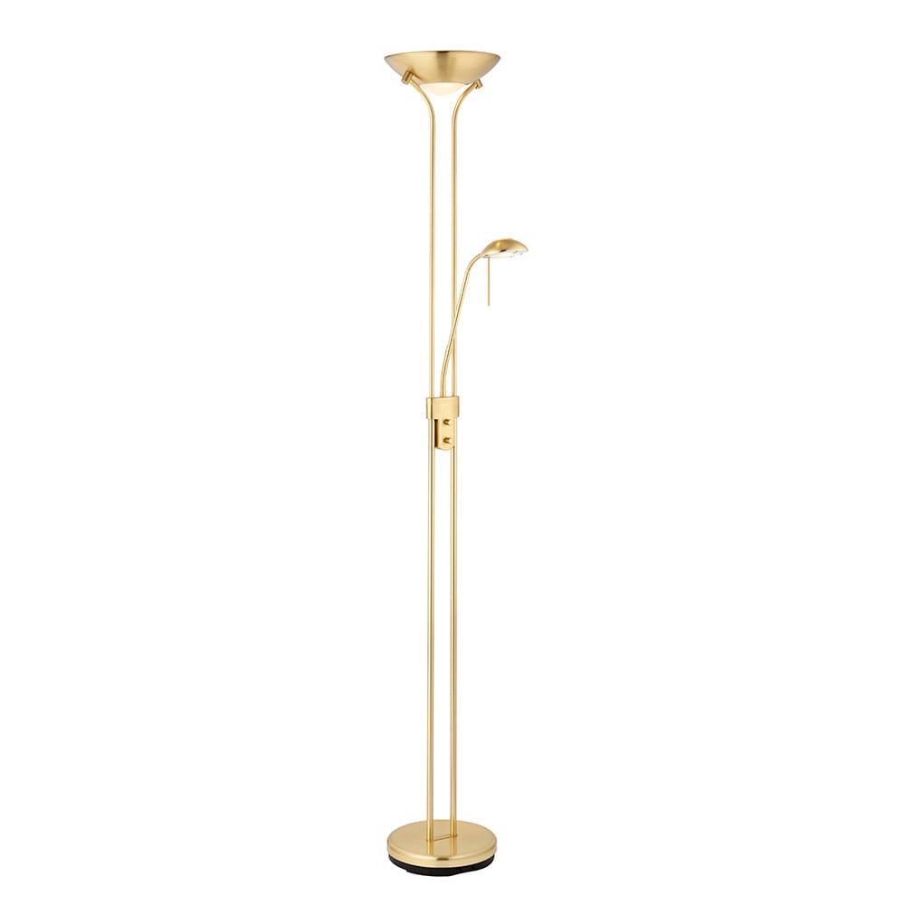 A tall 2 light floor lamp with a double stand supporting an uplighter as well as an adjustable branch holding a reading lamp. Satin brass plated metalwork with a opal glass diffuser, complete with an easy to reach double rotary dimmer switch.Compatible to use with LED and halogen lamps. Other colour options available