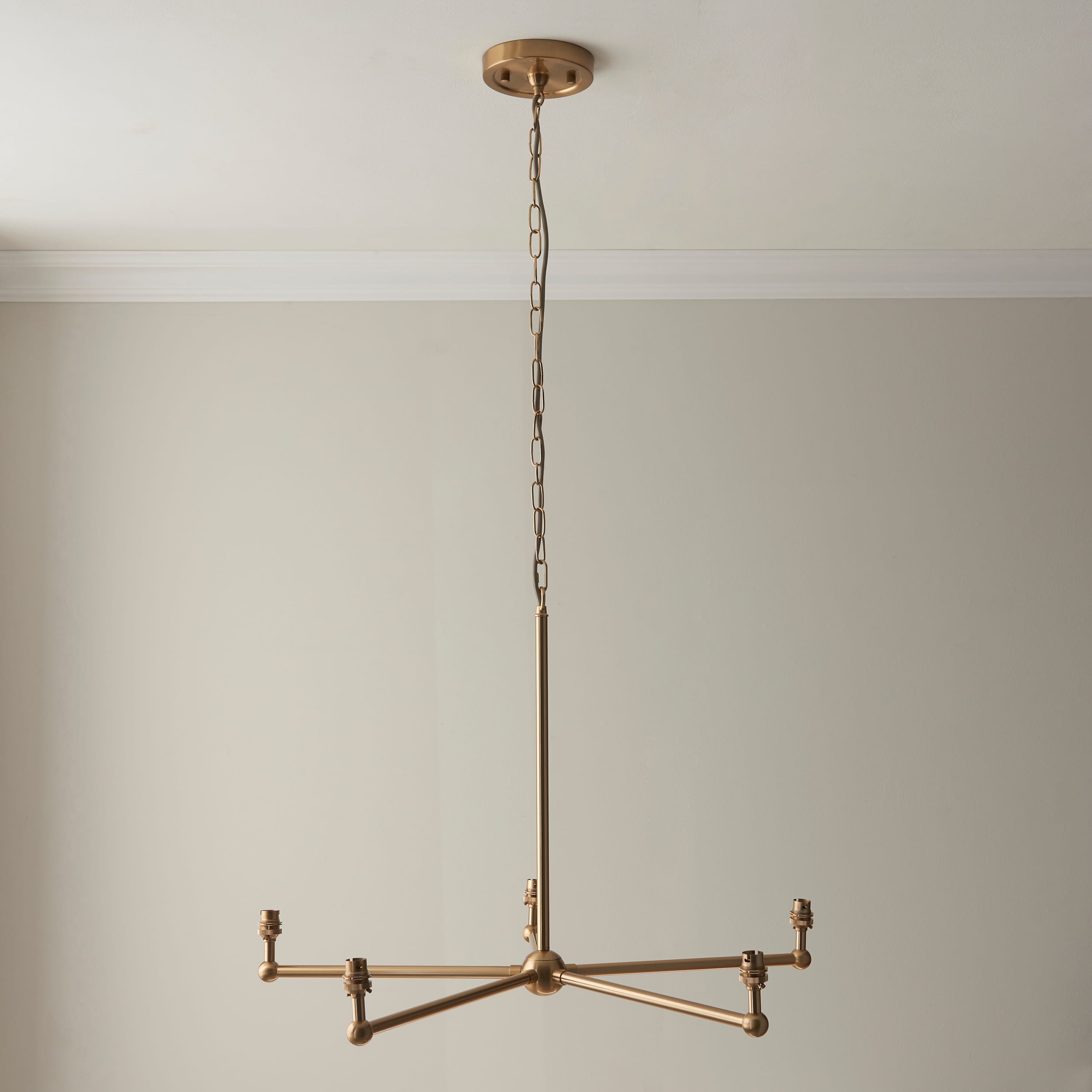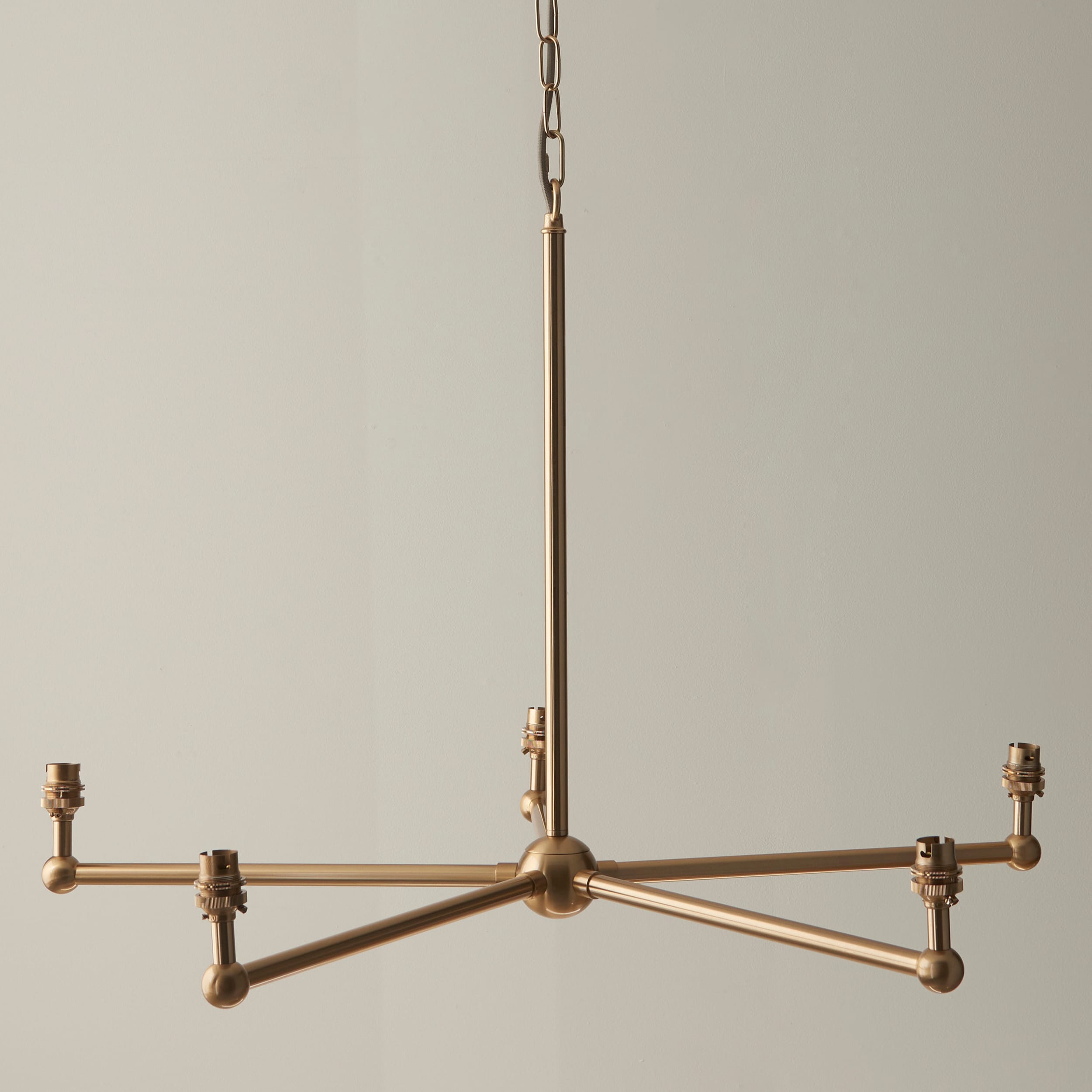 An elegant 5 light classic pendant fitting featuring B22 lamp holders for an authentic feel, finished in brushed aged brass, suspended from height adjustable 1.5m chain with grey braided fabric flex. This is a fitting only pendant, pair with five of our 16cm or 20cm decorative fabric shades to complete the look.Matching wall light, table light and linear pendant also available.